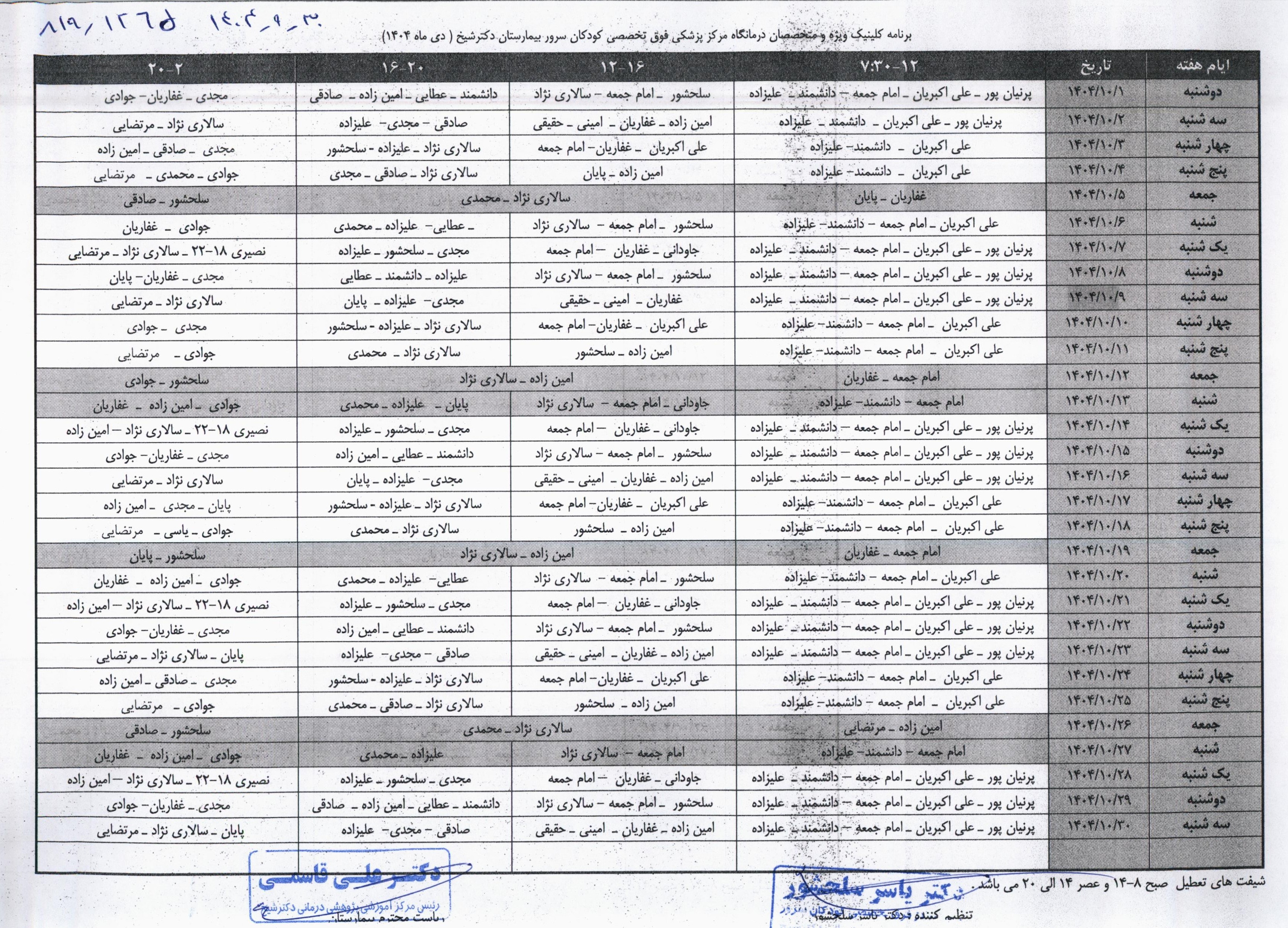 | برنامه آنکال جراحی و بیهوشی بیمارستان اکبر | برنامه فوق تخصص درمانگاه بیمارستان دکتر شیخ | |||||||||