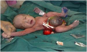 اگر این ساک پاره شود محتویات شکم از دیواره باز آن بیرون میریزند. در این بیماری حفره شکم از حد معمول کوچکتر است و باعث می شود تا بر گرداندن احشا به داخل این حفره مشکل شود.