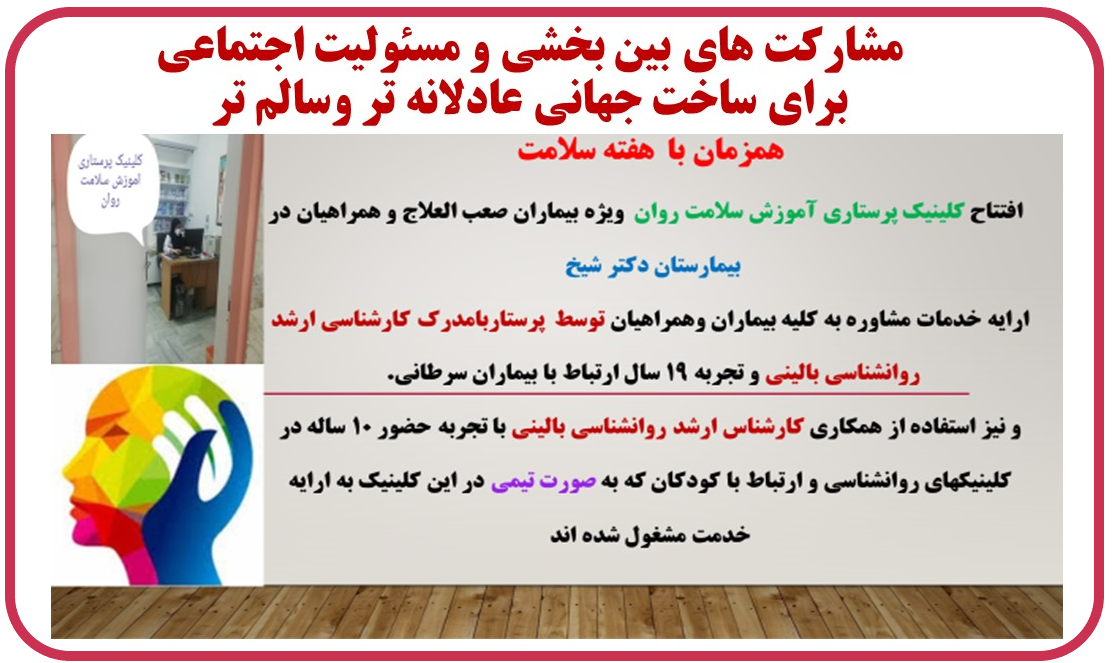 افتتاح کلینیک پرستاری آموزش سلامت روان ویژه بیماران صعب العلاج و همراهیان با همکاری کارشناس ارشد روانشناسی بالینی با سابقه 19 سال ارتباط با بیماران سرطانی و کارشناس ارشد روانشناسی بالینی با 10 سال سابقه فعالیت در کلینیک های روانشناسی و ارتباط با کودکان |