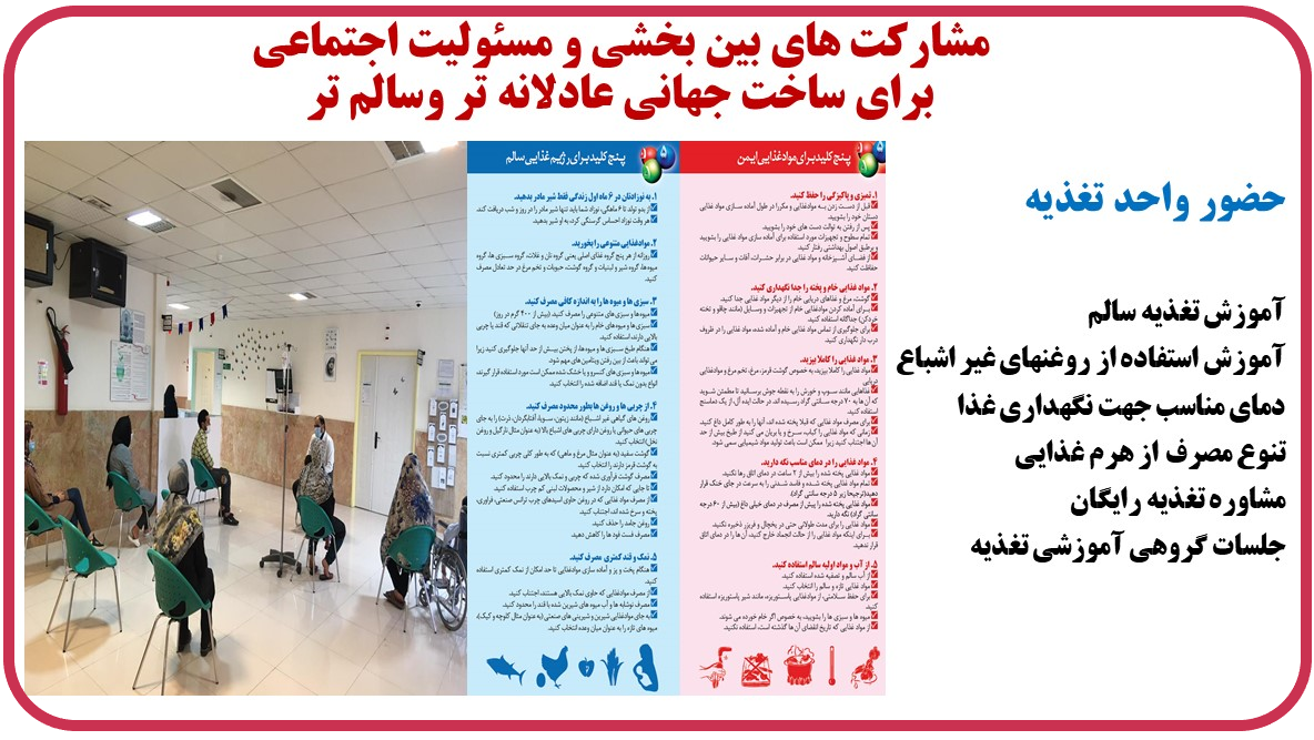 برگزاری جلسات گروهی آموزشی تغذیه توسط مسئول تغذیه بیمارستان در زمینه تغذیه سالم ، آموزش استفاده از روغنهای غیر اشباع، دمای مناسب جهت نگهداری غذا، تنوع مصرف از هرم غذایی و مشاوره تغذیه رایگان |