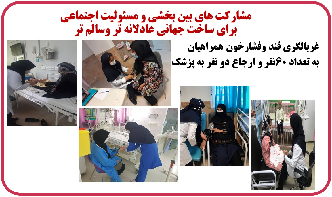 | غربالگری قند و فشارخون 60 نفر از همراهیان بیماران و ارجاع دو نفر به پزشک | ![]() |