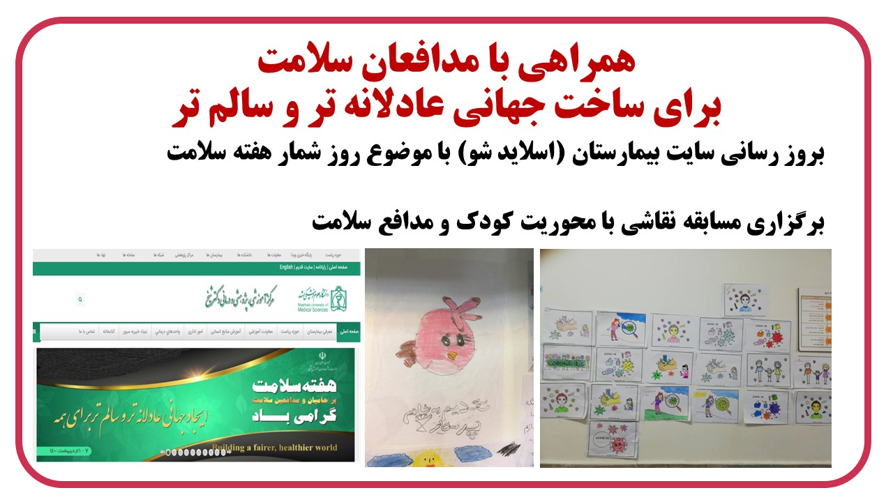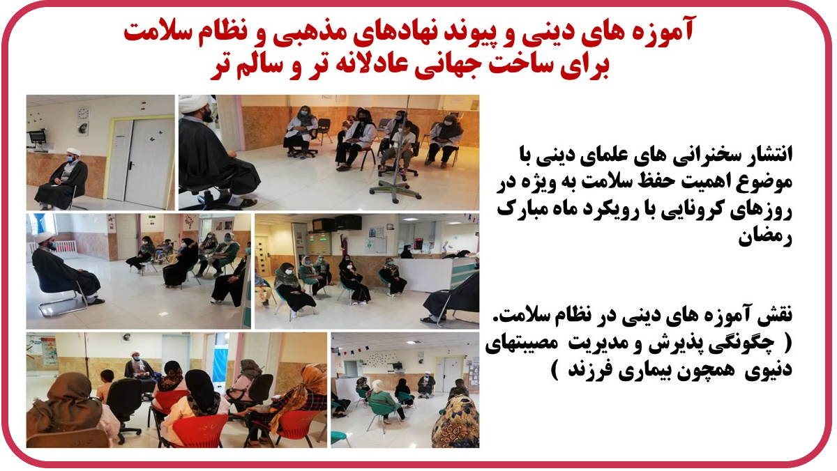برگزاری سخنرانی علمای دینی با موضوع اهمیت حفظ سلامت به ویژه در روزهای کرونایی با رویکرد ماه مبارک رمضان،نقش آموزه های دینی در نظام سلامت، چگونگی پذیرش و مدیریت مصیبتهای دنیوی همچون بیماری فرزند |