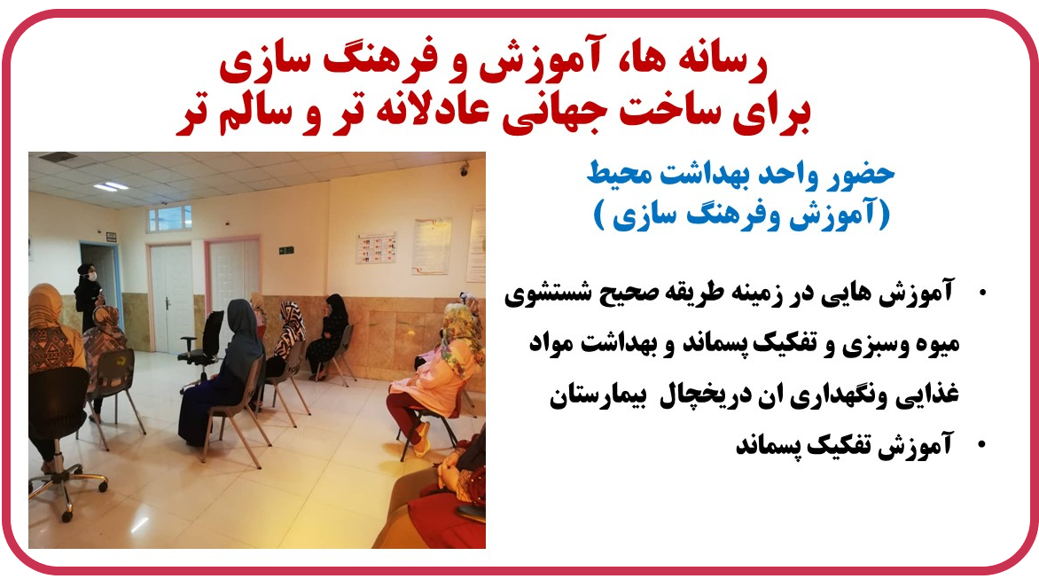 آموزش طریقه صحیح شستشوی میوه و سبزی و تفکیک پسماند و بهداشت مواد غذایی و نگهداری آن دریخچال بیمارستان و همچنین آموزش تفکیک پسماند توسط مسئول بهداشت محیط بیمارستان |