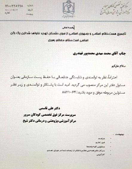 جناب آقای دکتر علی قاسمی سرپرست مرکز آموزشی، پژوهشی و درمانی کودکان دکتر شیخ، جناب آقای مهدی محمدپور را با حفظ سمت به عنوان مسئول دفتر ریاست بیمارستان منصوب نمود