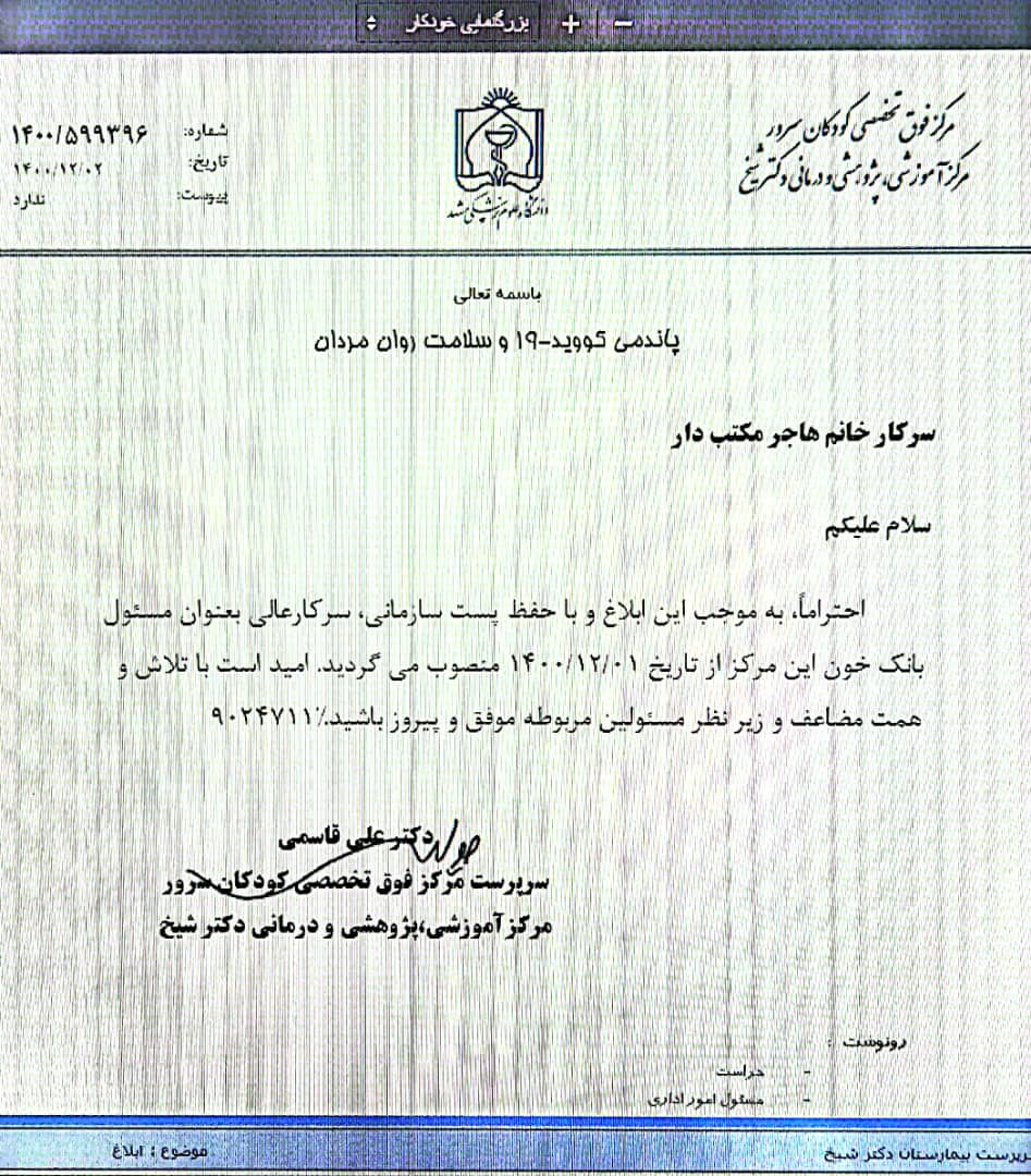 جناب آقای دکتر علی قاسمی سرپرست مرکز آموزشی، پژوهشی و درمانی کودکان دکتر شیخ، سرکار خانم هاجر مکتب دار کارشناس علوم آزمایشگاهی بیمارستان را از تاریخ اول اسفند ماه 1400 به عنوان مسئول بانک خون بیمارستان منصوب نمود.