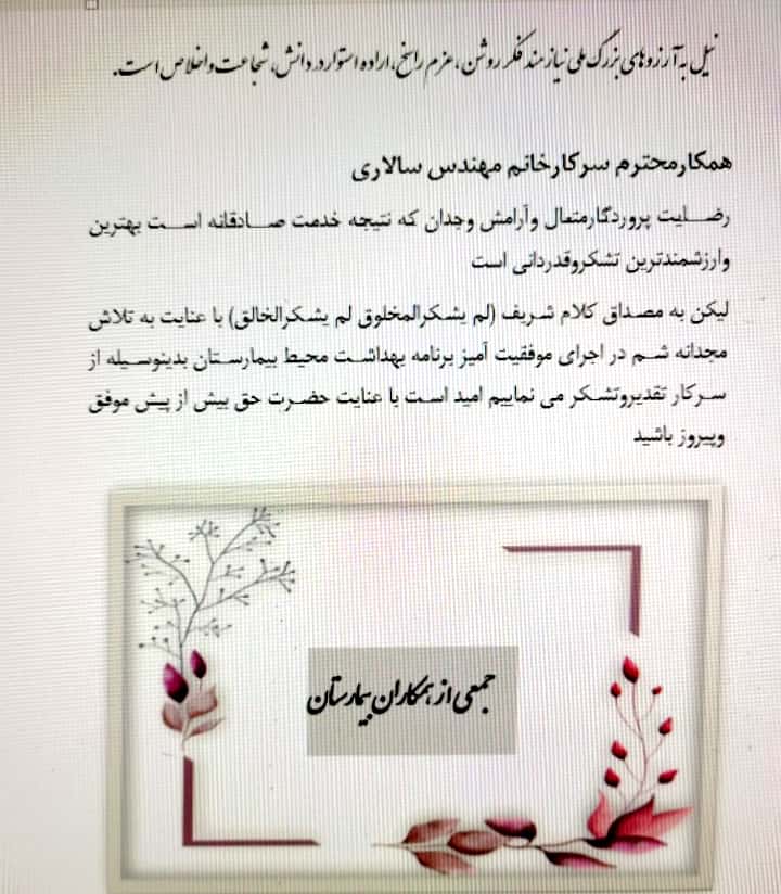 جمعی از همکاران واحد های بیمارستان به مناسبت پنجم اسفند روز بزرگداشت خواجه نصیرالدین طوسی و روز مهندس، از سرکار خانم مهندس سالاری مسئول بهداشت محیط بیمارستان تقدیر به عمل آوردند.