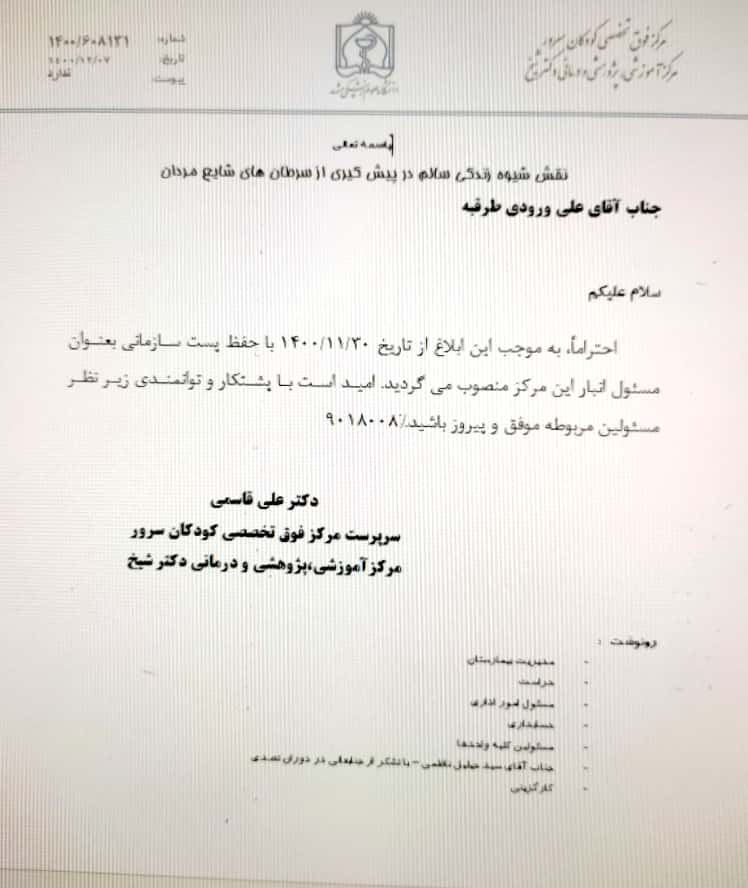جناب آقای دکتر علی قاسمی سرپرست مرکز آموزشی، پژوهشی و درمانی کودکان دکتر شیخ، جناب آقای ورودی را با حفظ پست سازمانی از تاریخ 30 بهمن ماه 1400 به عنوان مسئول انبار بیمارستان منصوب نمود.