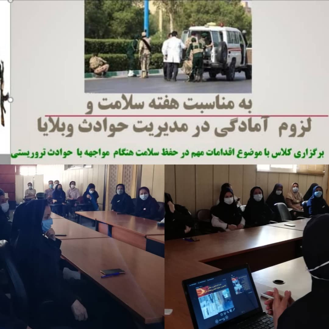 شنبه و یکشنبه مورخ 17 و 18 اردیبهشت ماه برگزاری کلاس آموزشی "مدیریت در حوادث تروریستی" و "حفظ سلامت در حوادث و بلایا به ویزه در حوادث تروریستی" در محل آمفی تئاتر بیمارستان توسط سرکار خانم وطن خواه به مناسبت هفته سلامت