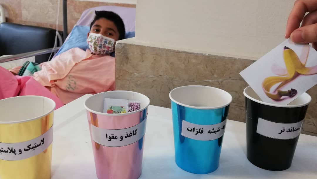 یکشنبه مورخ 18 اردیبهشت آموزش تفکیک پسماند به کودکان در بخش نفرولوژی بیمارستان از طریق بازی با کارتهای رنگی به عنوان زباله های خشک و تر و تهیه سطلهای زباله شبیه سازی شده.