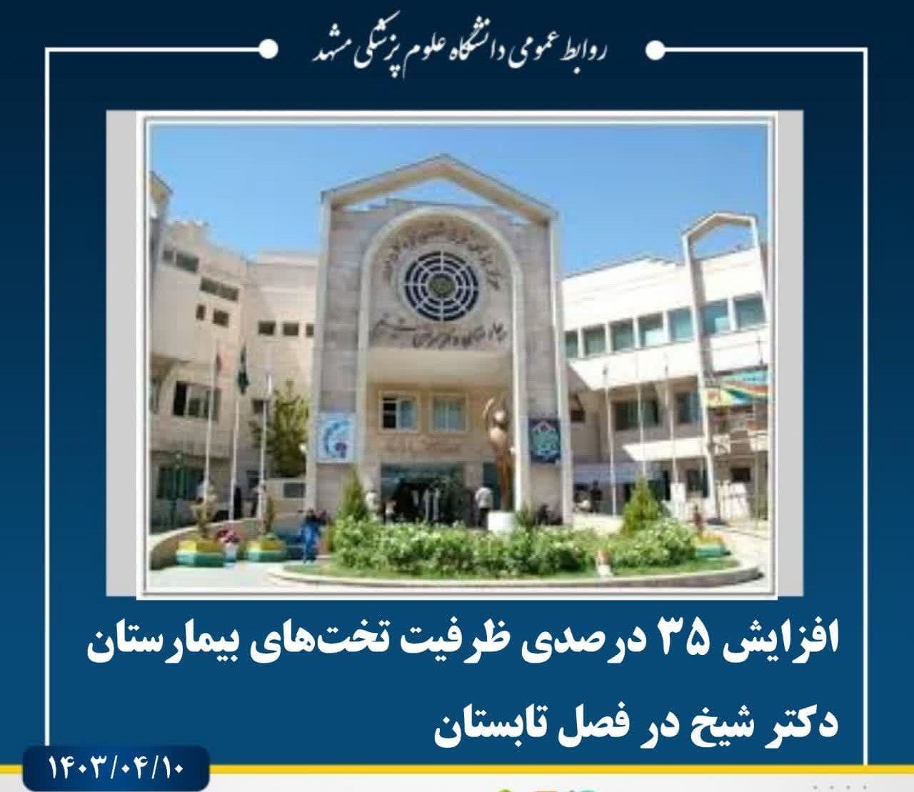مدیر بیمارستان دکتر شیخ از مراکز زیر پوشش دانشگاه علوم پزشکی مشهد گفت: ظرفیت تختهای این مرکز درمانی در آستانه شروع طرح تابستانه ٣۵ درصد افزایش یافته و از ١٨۰ مورد موجود به ٢۴۵ تخت رسیده است.